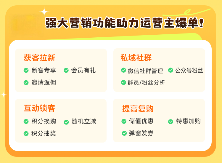 而且系统还自带拉新、复购的营销功能,发券、满减、社群运营