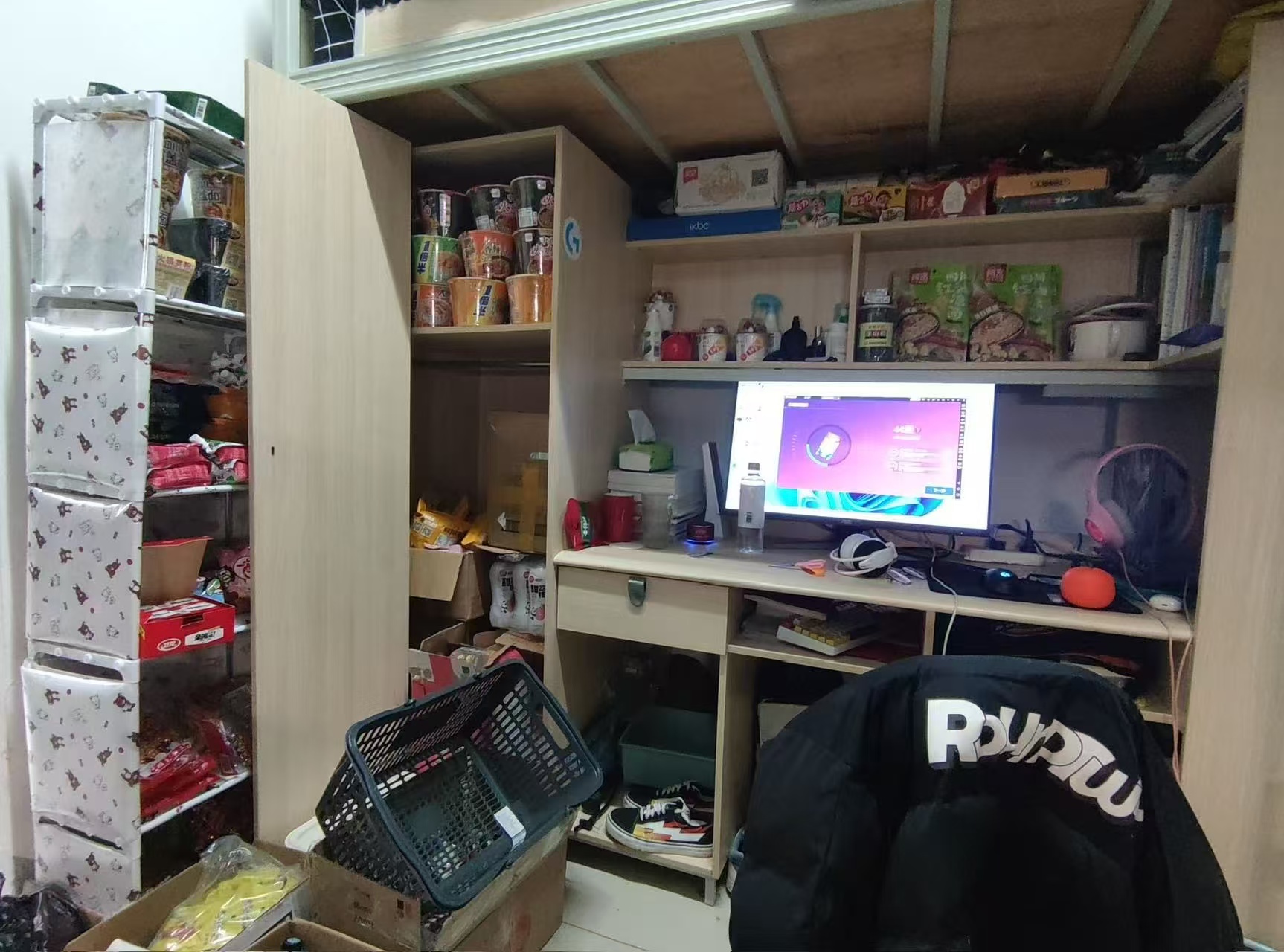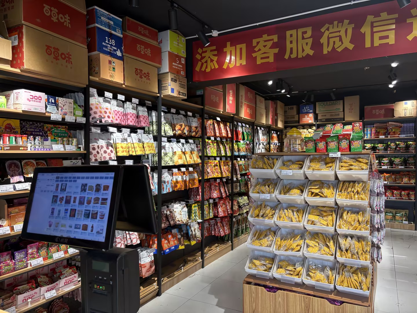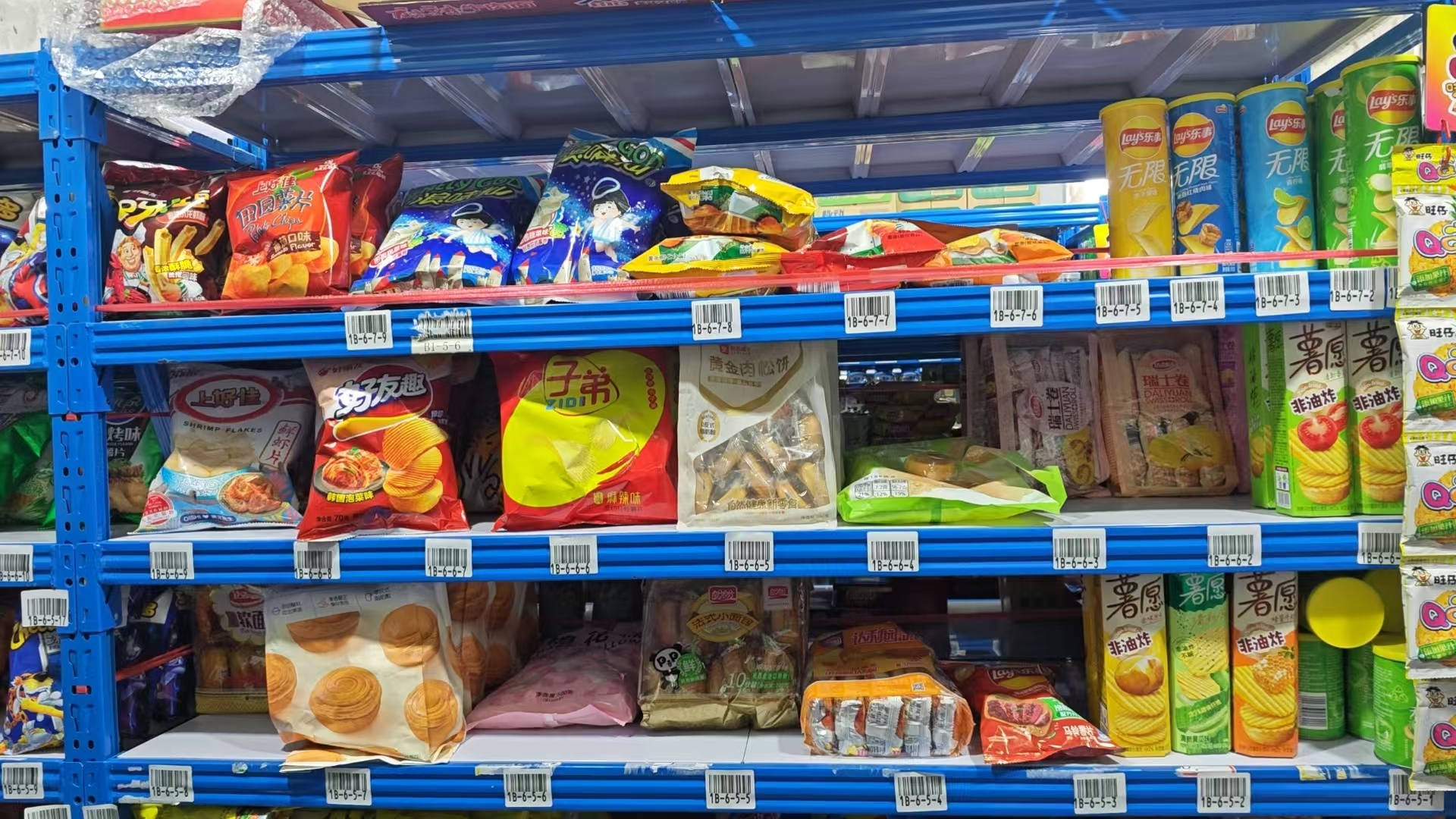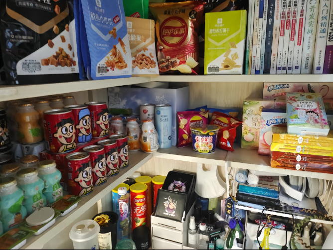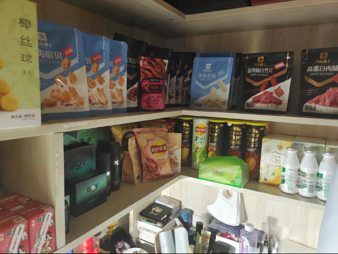 后面的空间,全部用来囤货,不管是本地的货源,还是 1688、拼多多的货,零副食、宿舍用品,全都能放,SKU 直接拉到 2000+,不用怕前店摆不下,线上都能卖。
