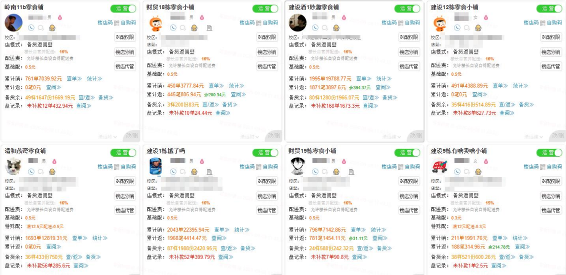 楼长只需要和你沟通好,从你的校园仓店拿货,他帮你卖,卖出去之后,他拿 15%左右的佣金(另外还有跑腿费),卖不掉的货,你直接拉回仓里,他一点风险都没有。