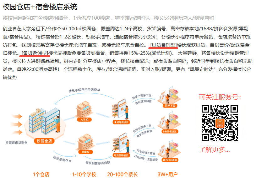 如果你现在也想抓住开学季的这波风口,把校园生意从 “小打小闹” 做成能长期盈利的生态,不妨试试这套校园仓店 + 宿舍楼店的模式。